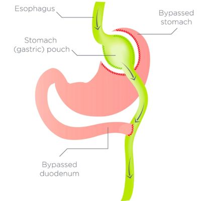 In the gastric bypass, the stomach is permanently divided to create a small gastric “pouch” that limits the size of meals. The small intestine is then connected to the upper pouch so that food “bypasses” the remainder of the stomach and the first part of the small intestine. This limits the calories and nutrients that can be absorbed, and immediately changes many of the hormones that regulate weight and weight-related comorbidities.